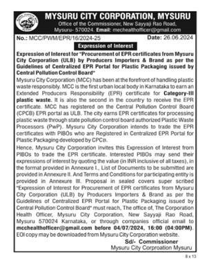 Mysuru, known for its rich cultural heritage, faced challenge of plastic pollution due to improper disposal of non-recyclable plastic waste. To counter this Mysuru City Corporation (MCC) partnered with a local recycler (M/s. Jagruth Tech Private Limited) to repurpose non-recyclable plastic waste into eco-friendly products such as plastic tiles and paver blocks. These plastic tiles are used as interlocking tiles for pavements and laying footpaths. This made Mysuru City Corporation (MCC), first urban local body in Karnataka which earned an Extended Producer Responsibility (EPR) certificate for processing Category-III plastic waste.